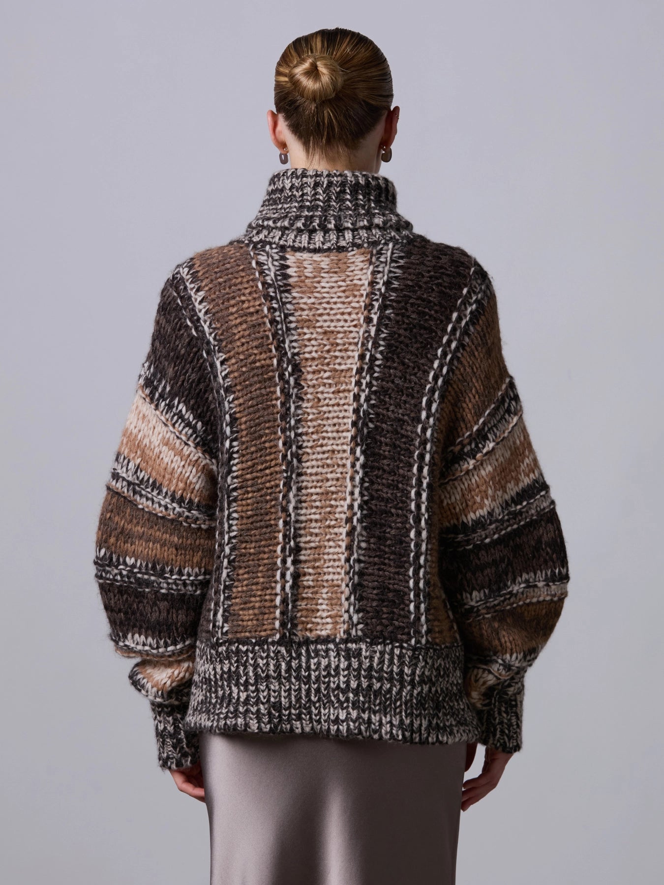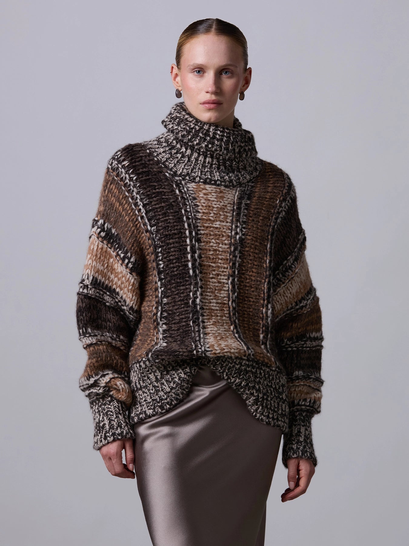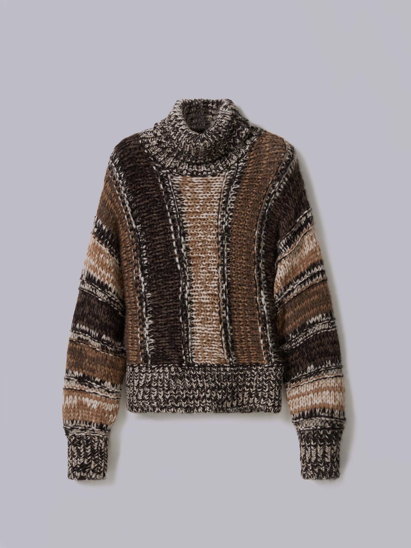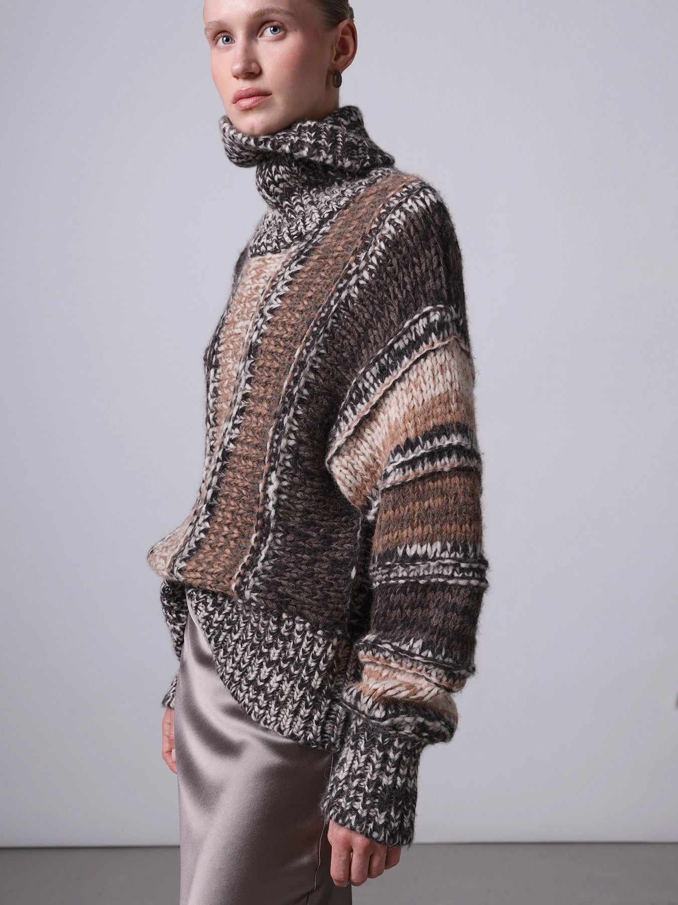 Oversized turtleneck sweater made from a blend of wool and alpaca with a soft, lightweight feel. It features dropped shoulders and a pattern that mixes different types of stripes, colors, and mouliné effects. Finished with high ribbed cuffs and hem.